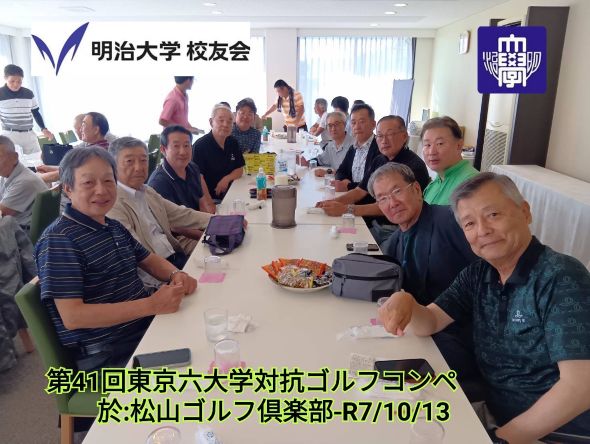 第41回東京六大学OB対抗ゴルフコンペに参加しました 2025年10月13日(月)開催の第41回東京六大学OB対抗ゴルフコンペに我が明治大学から12名の校友が参加しました。 上位5名のGROSSスコアは440でトップの成績を収めましたが、NETでは惜しくも5位となりました。参加された校友の皆様、お疲れ様でした。