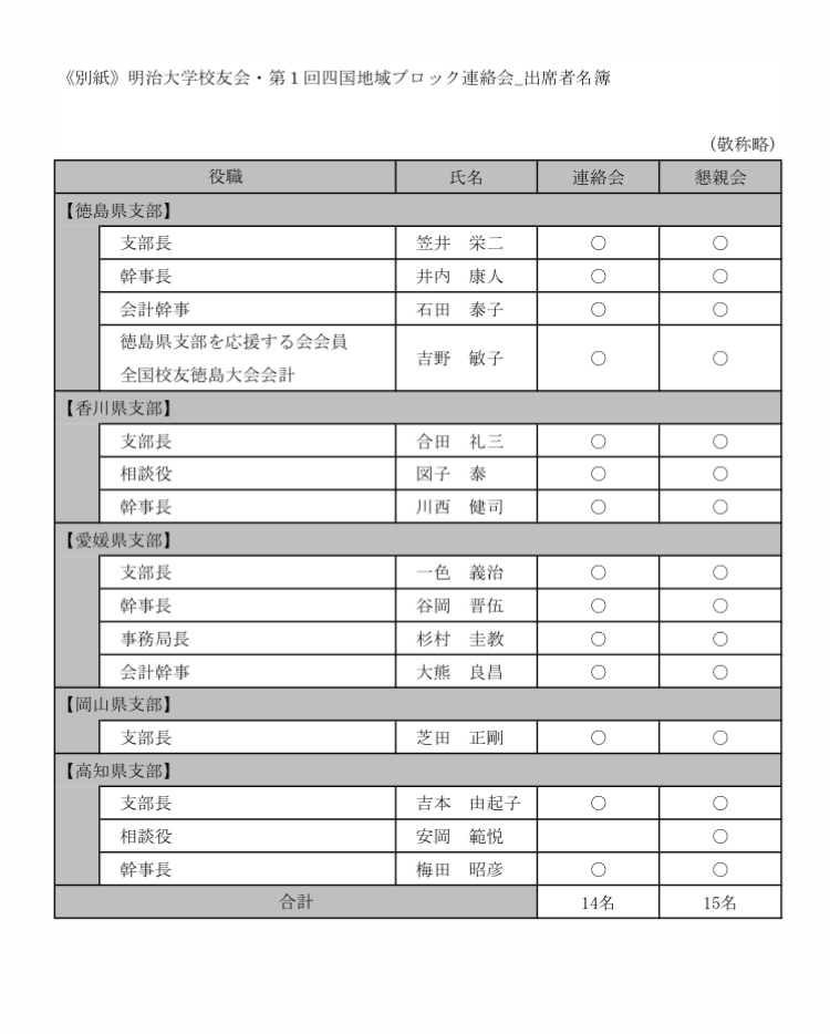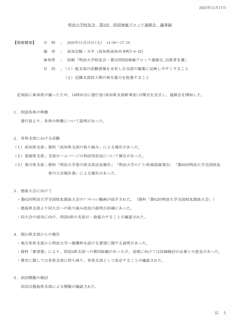 第1回 四国地域ブロック連絡会に出席しました 2025年11月15日(土)15:00から高知県高知市本町の高知会館において開催された、明治大学校友会第1回四国地域ブロック連絡会に出席しました。愛媛県支部からは一色義治支部長、谷岡晋伍幹事長、杉村圭教事務局長、大熊良昌会計幹事の四名が出席しました。今回は四国地域ブロック連絡会の初回ということで高知県支部の皆様には会場・宿泊先の手配等で大変お世話になりました。ありがとうございました。