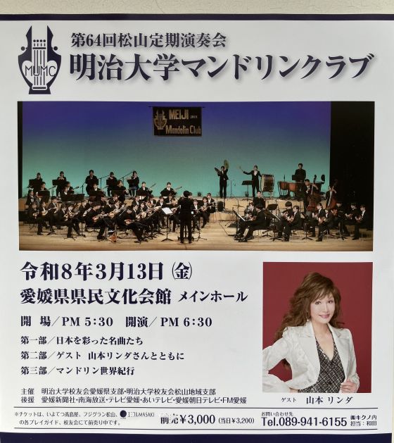明治大学マンドリンクラブ松山定期演奏会のお知らせ 明治大学マンドリンクラブ第64回松山定期演奏会を下記のとおり開催いたします。 開催日時:令和8年3月13日(金) 開場17:30 開演18:30 開催場所:愛媛県県民文化会館 メインホール ゲ ス ト:山本リンダ 入 場 料:前売 3,000円 当日 3,200円