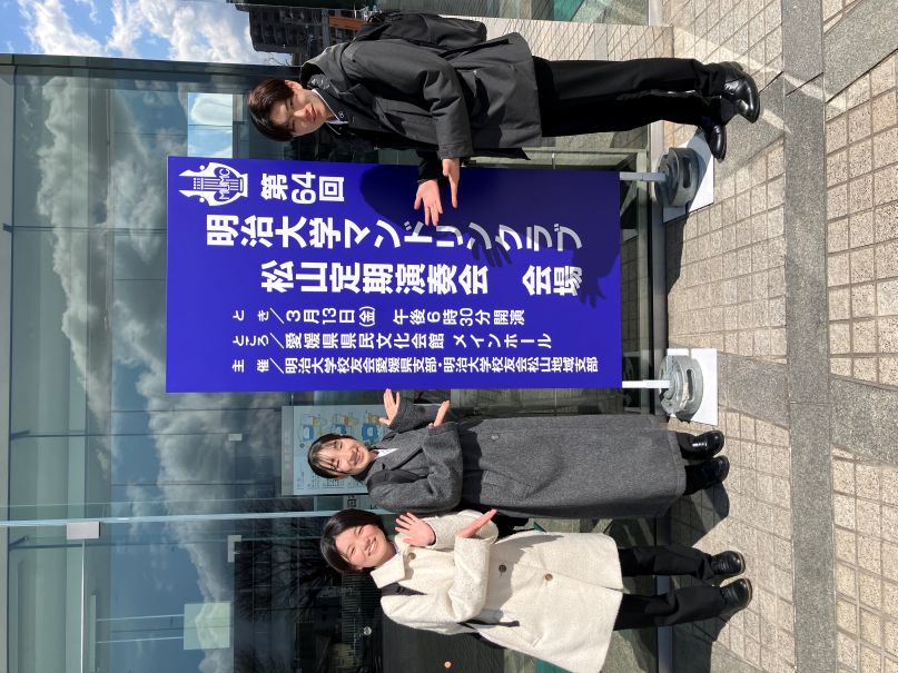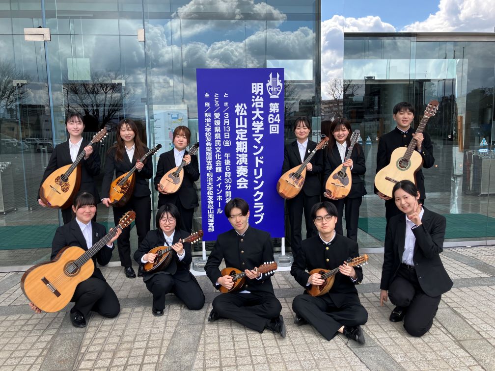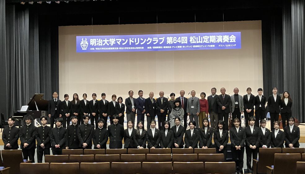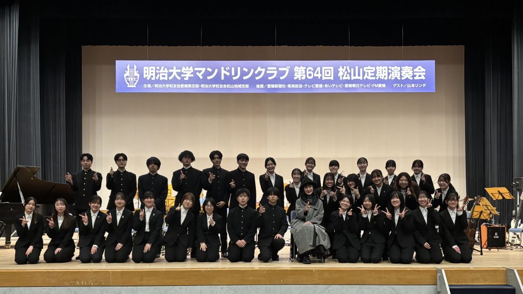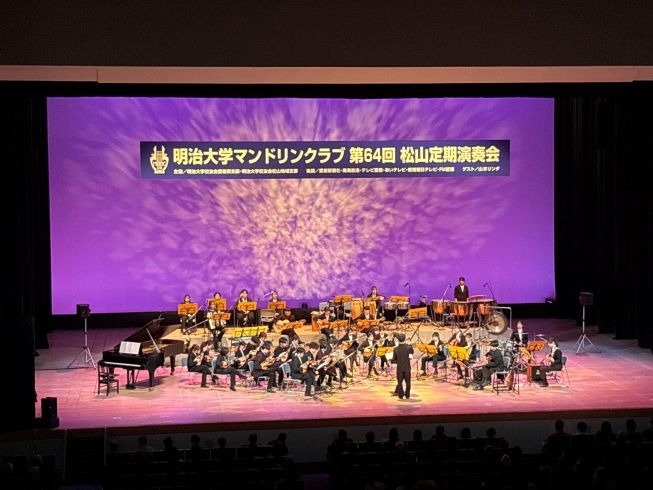 第64回明大マンドリンを開催しました2025年3月13日(金)に愛媛県県民文化会館において、第64回明治大学マンドリンクラブ松山定期演奏会を開催しました。開場の17時30分前には多くのマンドリンファンで長蛇の列が続き、会場1階はほぼ満席となる盛況ぶりでした。今回のマンドリンクラブコンサートの司会を務めた片桐花さんから、第1部は「日本を彩った名曲たち」、第2部は「本日のゲスト、山本リンダさんとともに」、第3部は「マンドリン世界紀行」をお届けしますとの説明があり開演しました。